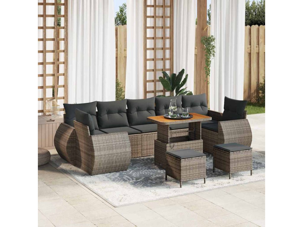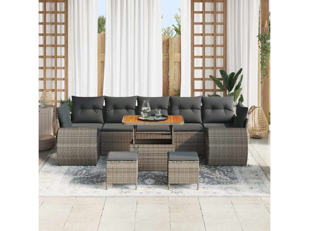 - Spolehlivé materiály Tato zahradní souprava se pyšní kombinací práškově lakované oceli a poly ratanu, což zajišťuje robustnost a atraktivní vzhled. Přidání akáciového dřeva dodává přírodní nádech a texturu, takže se hodí do různých zahradních stylů.