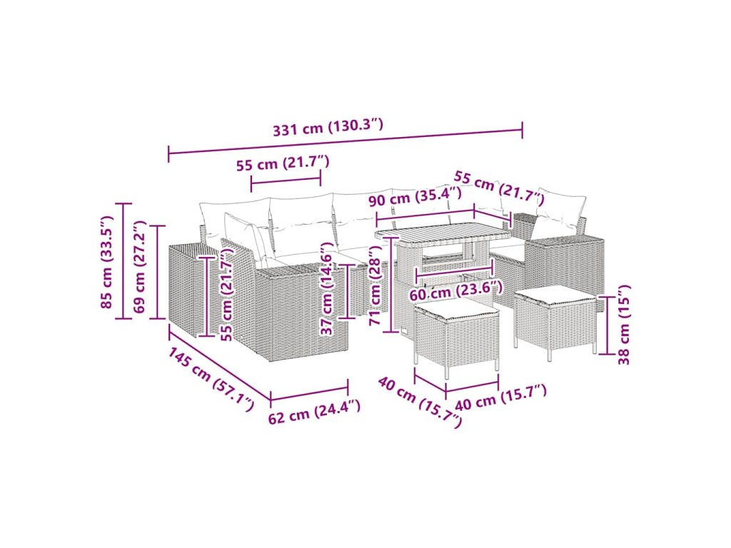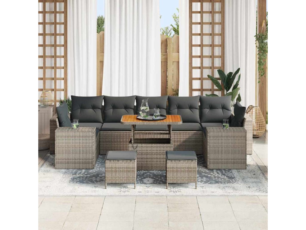 - Zahrnuté komponenty: Set obsahuje čtyři pohovky s opěrkami a tři středové sedáky, každý má široké opěradlo pro pohodlí. Design z poly rátanu zajišťuje podporu, zatímco polyesterové polstrování přidává pohodlí. Výškově nastavitelný stolek snadno změníte z kávového na jídelní stůl a taburety doplňují set.