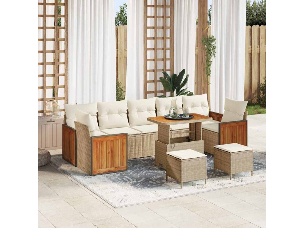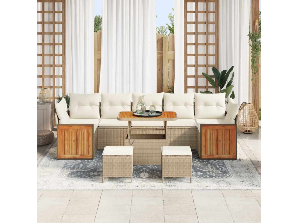- Materiály: Tento set je z poly ratanu, což je lehký, ale pevný materiál, a přírodní akáciové dřevo na povrchu dodává na eleganci. Je odolný proti různým počasím, takže zůstane hezký a komfortní.