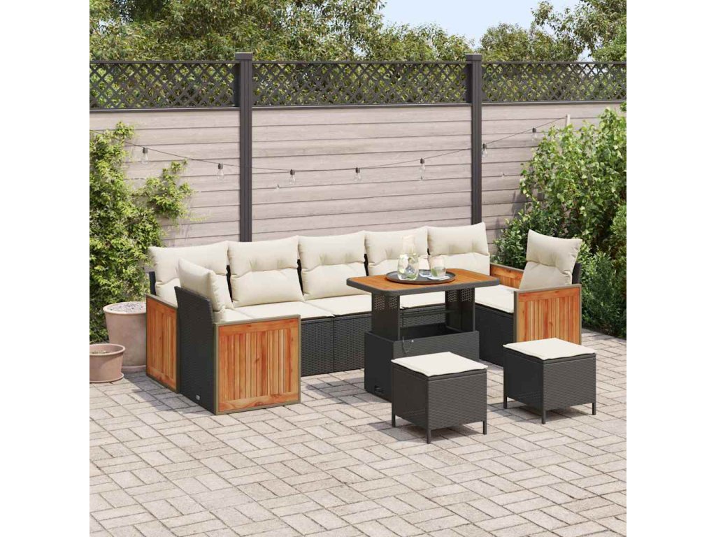 - Materiály: Tento set je z poly ratanu, což je lehký, ale pevný materiál, a přírodní akáciové dřevo na povrchu dodává na eleganci. Je odolný proti různým počasím, takže zůstane hezký a komfortní.