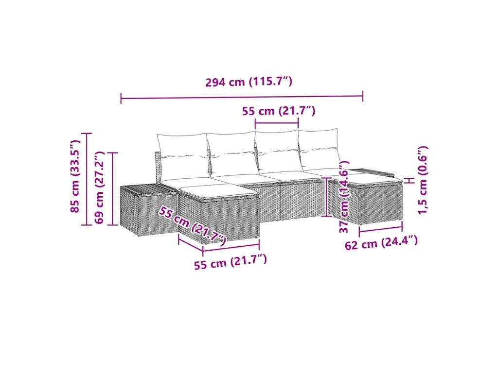- 2 x Boční pohovka: 184×62×85 cm (Š×H×V)