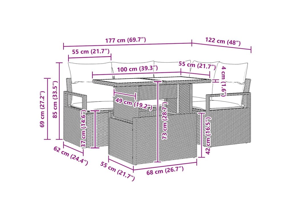 - Péče o údržbu: Aby pohovka vypadala pořád jako nová, používej kryt, když ji nepoužíváš, a ukládej polštáře dovnitř, když je špatné počasí. Tento jednoduchý přístup pomůže udržet její atraktivitu a usnadní údržbu, což ti umožní si vychutnat léta pohody a radosti s touto sadou.