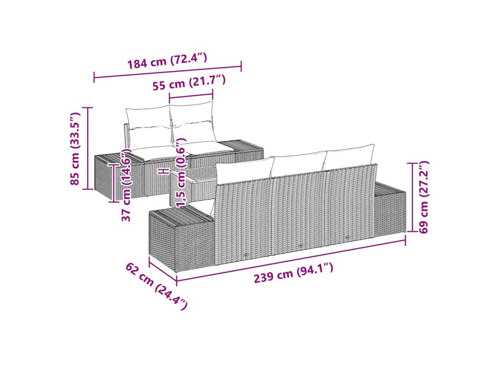- Součásti setu: Sada obsahuje pohodlné sedací možnosti a zahradní stůl. Středové sedadlo má rozměry 55 x 62 x 69 cm, čtyři boční pohovky měří 92 x 62 x 69 cm a stůl 55 x 55 x 37 cm. Každý prvek zvyšuje funkčnost a přitažlivost celého setu.