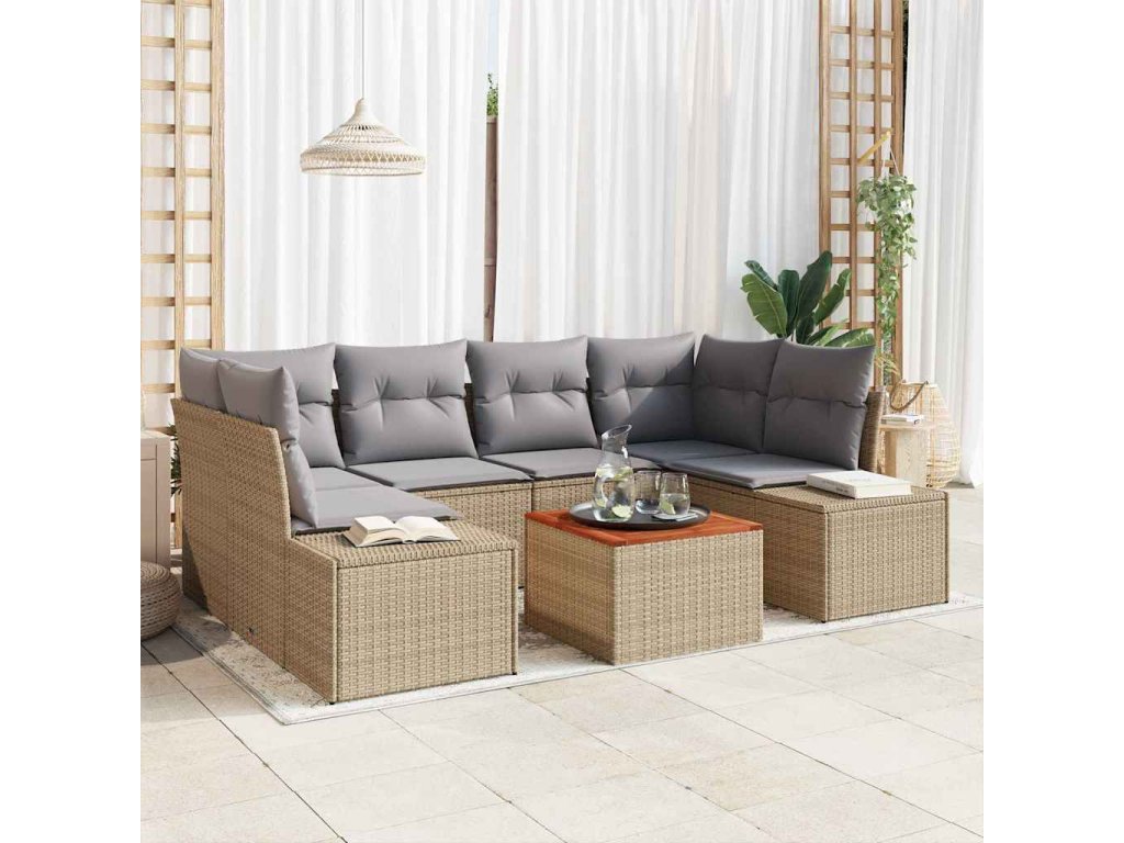 - Materiály: Vyrobeno z odolného poly ratanu a akáciového dřeva, tahle souprava to zvládne venku. Poly ratan vypadá moderně a tkaná struktura je nejen hezká, ale i odolná vůči povětrnostním vlivům. Masivní akáciové dřevo dodává eleganci a sílu celému kusu.