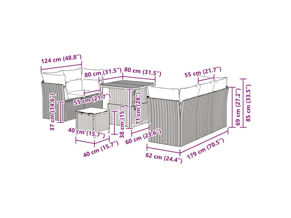 - Materiály: Tento set kombinuje poly ratan a masivní akáciové dřevo, což zajišťuje sílu a eleganci. Poly ratan je moderní, odolný proti UV záření, vlhkosti a opotřebení, zatímco akácie dodává stabilní základ pro venkovní použití po celý rok.