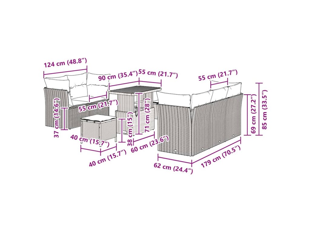 - Materiály: Tento set kombinuje poly ratan a masivní akáciové dřevo, což zajišťuje sílu a eleganci. Poly ratan je moderní, odolný proti UV záření, vlhkosti a opotřebení, zatímco akácie dodává stabilní základ pro venkovní použití po celý rok.