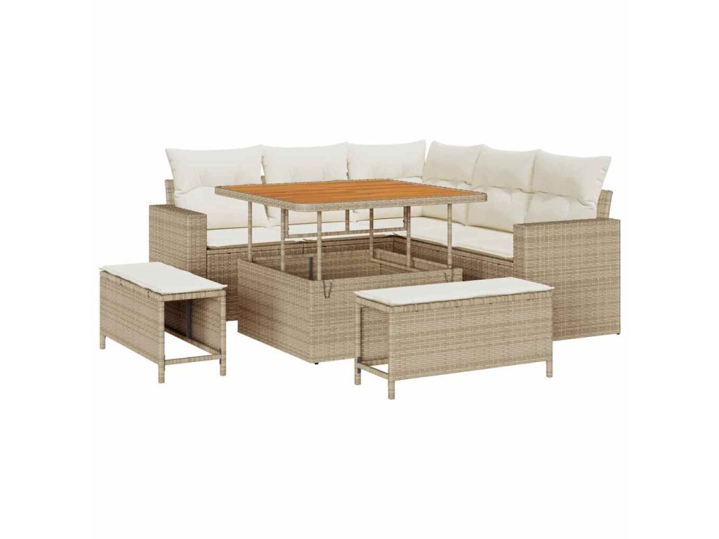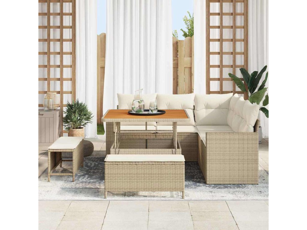 - Vysoce kvalitní materiály Sedací souprava je z prvotřídního poly ratanu a odolného masivního akáciového dřeva. Navrženo tak, aby vydrželo, materiály zajišťují, že set odolává slunci a dešti, přičemž si udrží eleganci a strukturu po sezónách.