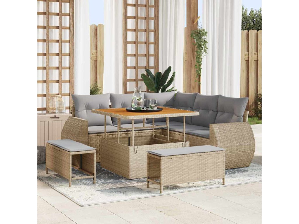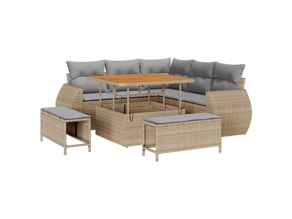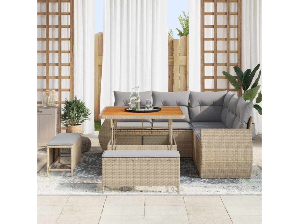 - Prémiové materiály: S odolným poly ratanem a masivním akáciovým dřevem, tento set je postavený, aby vydržel a odolával UV záření. Tyto materiály zaručují pevnost a zároveň dodávají super texturu celému vzhledu.