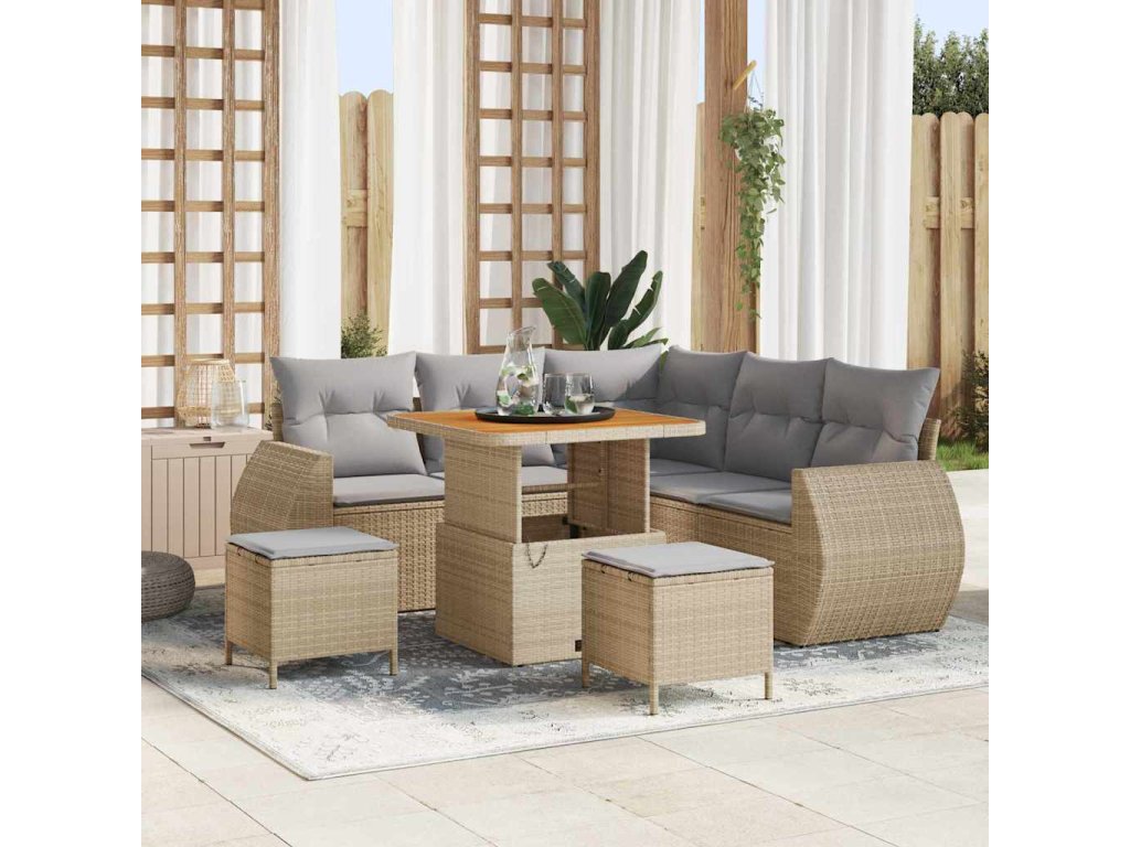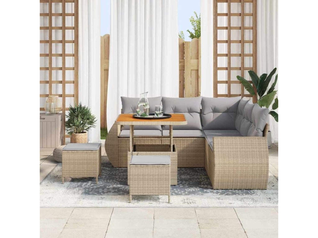 - Prémiové materiály: S odolným poly ratanem a masivním akáciovým dřevem, tento set je postavený, aby vydržel a odolával UV záření. Tyto materiály zaručují pevnost a zároveň dodávají super texturu celému vzhledu.