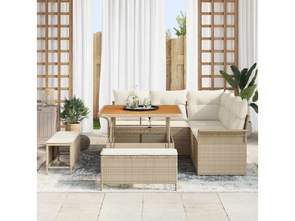 Tato moderní zahradní pohovka nabízí perfektní řešení pro venkovní posezení a jídelnu díky svému jednoduchému designu, který se hodí do jakékoli současné zahrady či terasy. Silný rám z poly ratanu a akaci jí dodává styl a funkčnost. Ideální na slunné dny, zve rodinu a přátele, aby se sešli a užili si venkovní atmosféru.