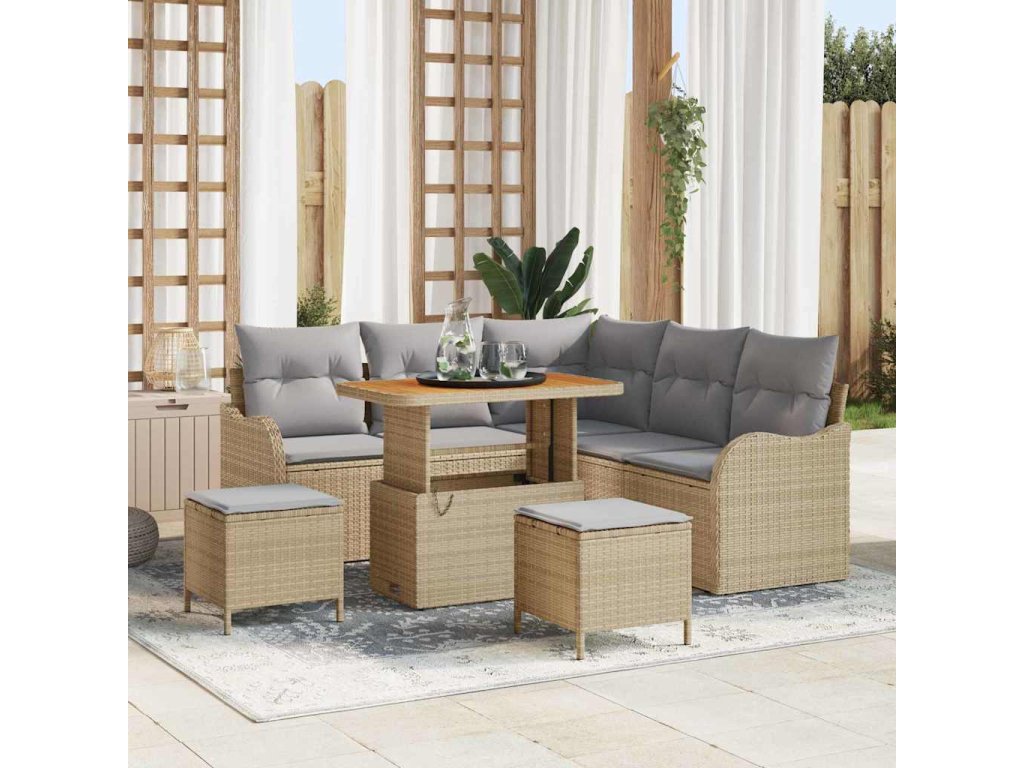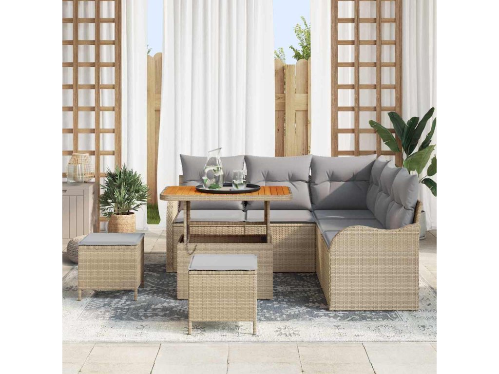 - Flexibilní funkce: Výškově nastavitelný stůl umožňuje snadné přechody od kávových chvílí po slavnostní večeře. Modulární design dává možnost přizpůsobení podle preferencí uživatele. Lehké provedení usnadňuje přesun pohovky po zahradě a UV odolnost chrání před vyblednutím na slunci.