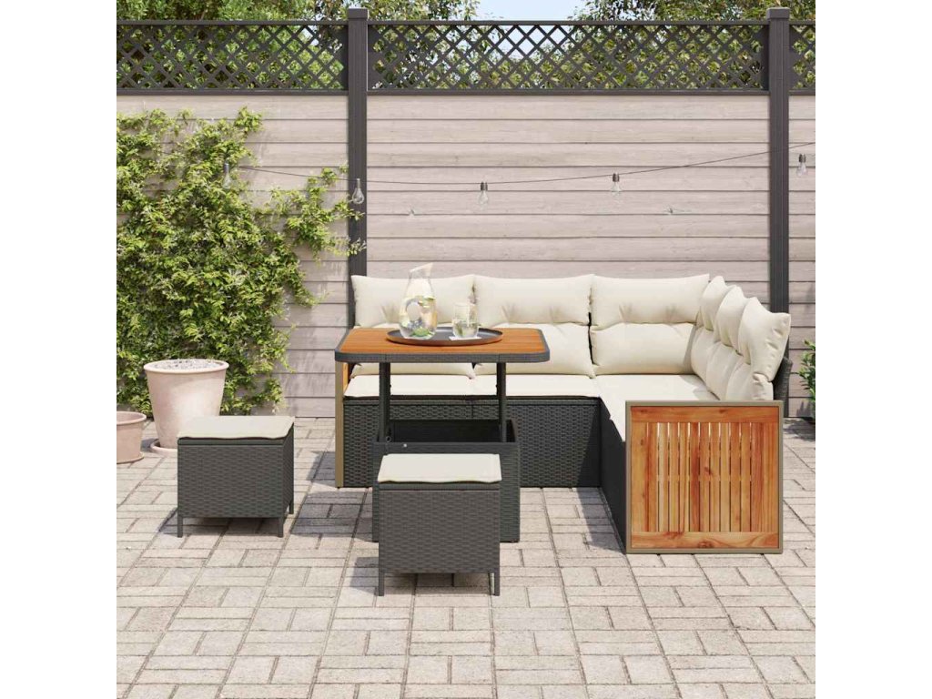 - Materiály: Tato hezká zahradní souprava má pevný rám z práškově lakované oceli, který zajišťuje stabilitu a drží polyratan. Akáciové dřevo přidává pěkný přírodní vzhled a zvyšuje estetiku i odolnost. Materiály jsou UV-odolné, takže set vydrží dlouho i na slunci.