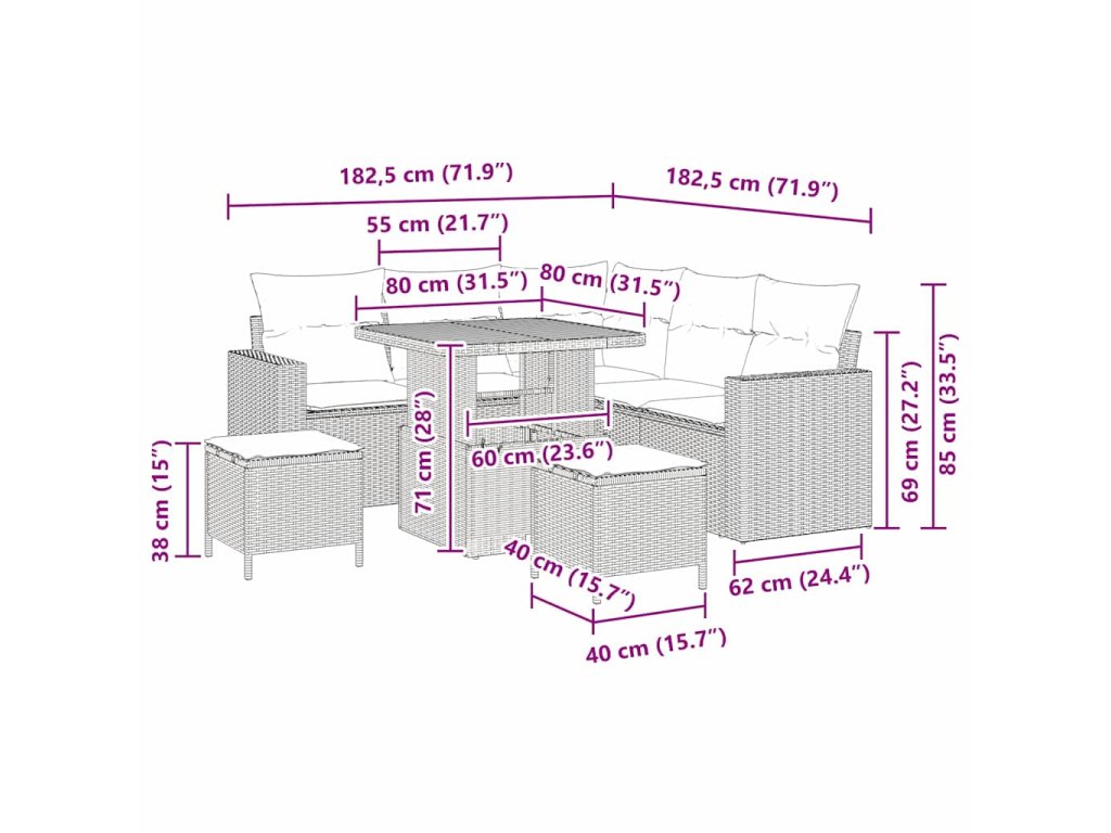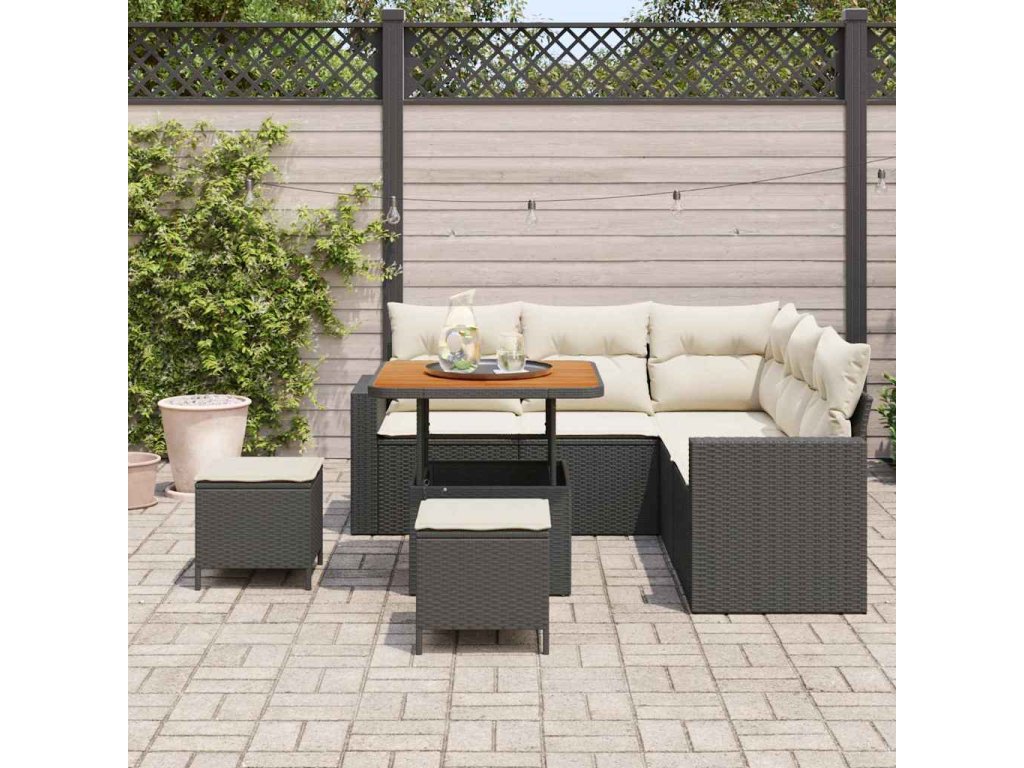 - Vysoce kvalitní materiály Sedací souprava je z prvotřídního poly ratanu a odolného masivního akáciového dřeva. Navrženo tak, aby vydrželo, materiály zajišťují, že set odolává slunci a dešti, přičemž si udrží eleganci a strukturu po sezónách.