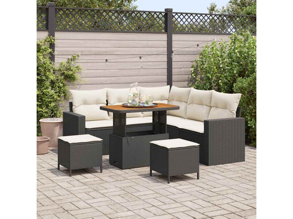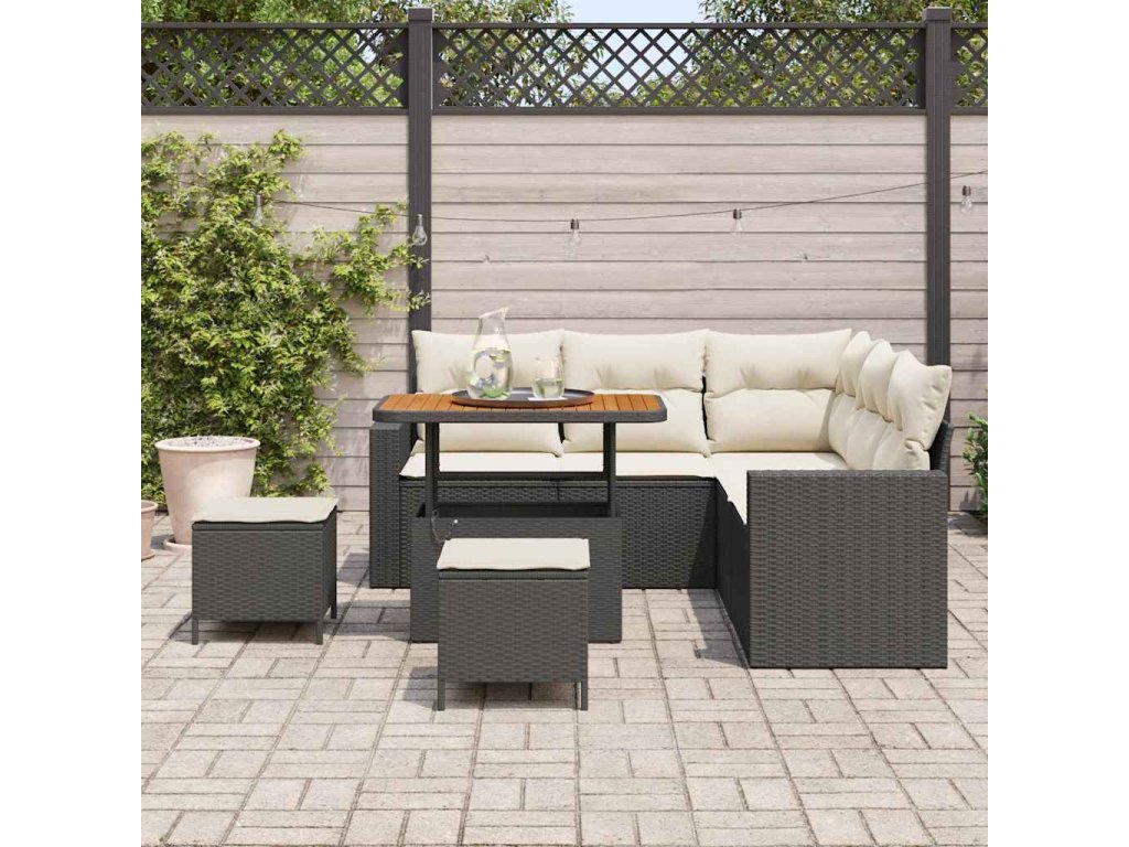 - Vysoce kvalitní materiály Sedací souprava je z prvotřídního poly ratanu a odolného masivního akáciového dřeva. Navrženo tak, aby vydrželo, materiály zajišťují, že set odolává slunci a dešti, přičemž si udrží eleganci a strukturu po sezónách.
