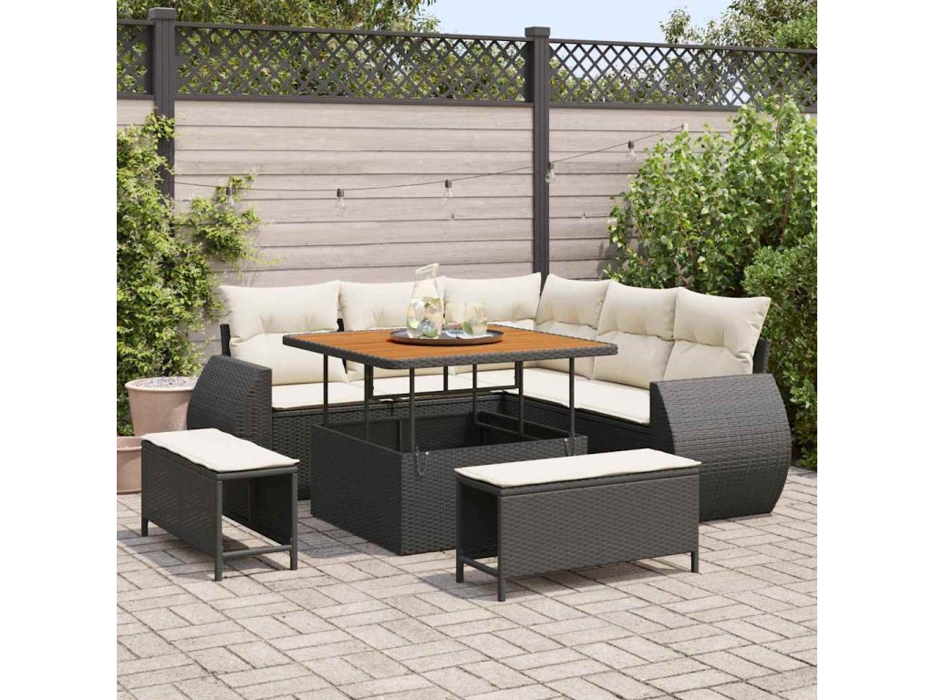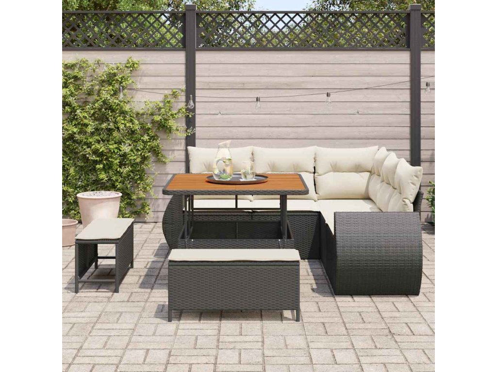 - Prémiové materiály: S odolným poly ratanem a masivním akáciovým dřevem, tento set je postavený, aby vydržel a odolával UV záření. Tyto materiály zaručují pevnost a zároveň dodávají super texturu celému vzhledu.