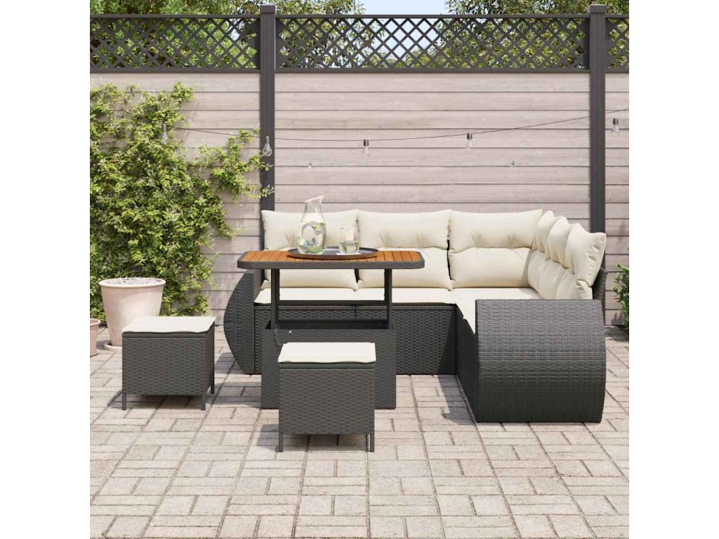 - Prémiové materiály: S odolným poly ratanem a masivním akáciovým dřevem, tento set je postavený, aby vydržel a odolával UV záření. Tyto materiály zaručují pevnost a zároveň dodávají super texturu celému vzhledu.