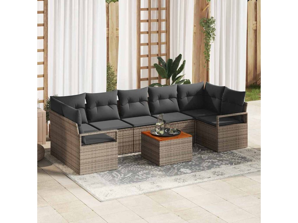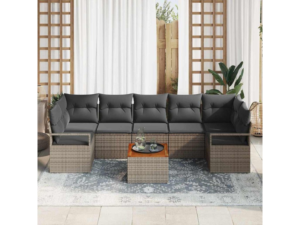 - Materiály: Tento sofa set je vyroben z polyratanu a masivního akáciového dřeva, což zajišťuje odolnost a styl. Polyratan vypadá skvěle a je odolný proti UV záření, vlhkosti a povětrnostním vlivům. Dřevo dodává přírodní vzhled a charakter.