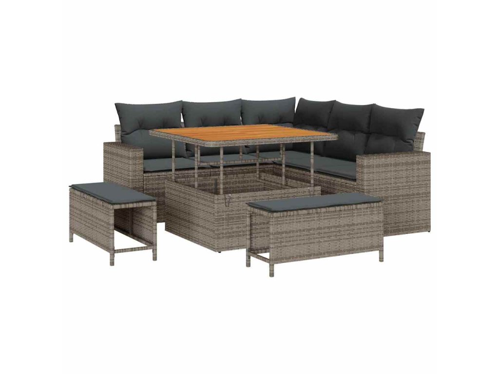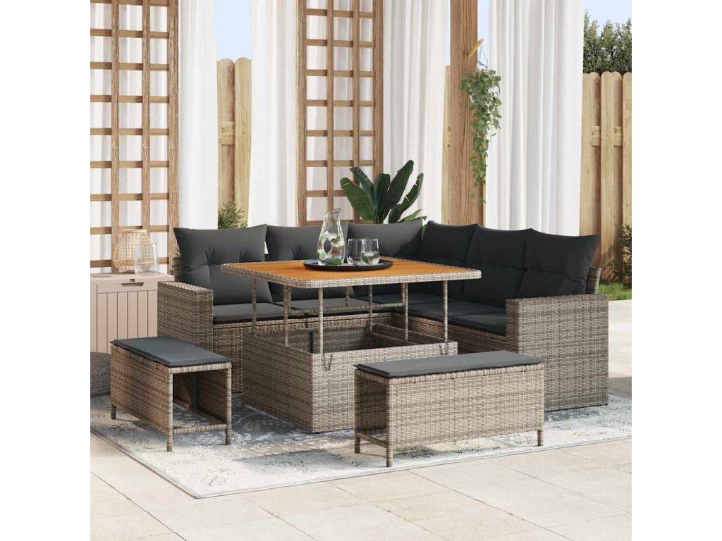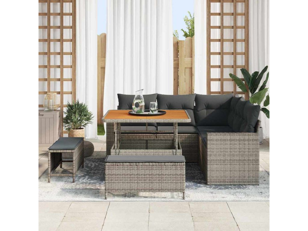 - Vysoce kvalitní materiály Sedací souprava je z prvotřídního poly ratanu a odolného masivního akáciového dřeva. Navrženo tak, aby vydrželo, materiály zajišťují, že set odolává slunci a dešti, přičemž si udrží eleganci a strukturu po sezónách.