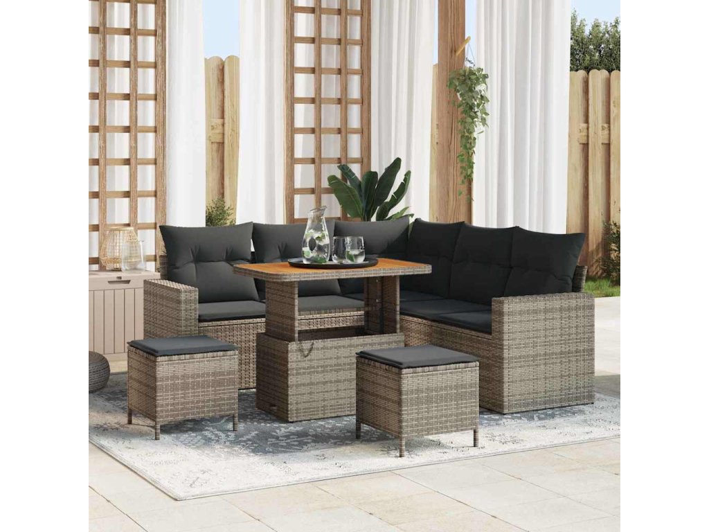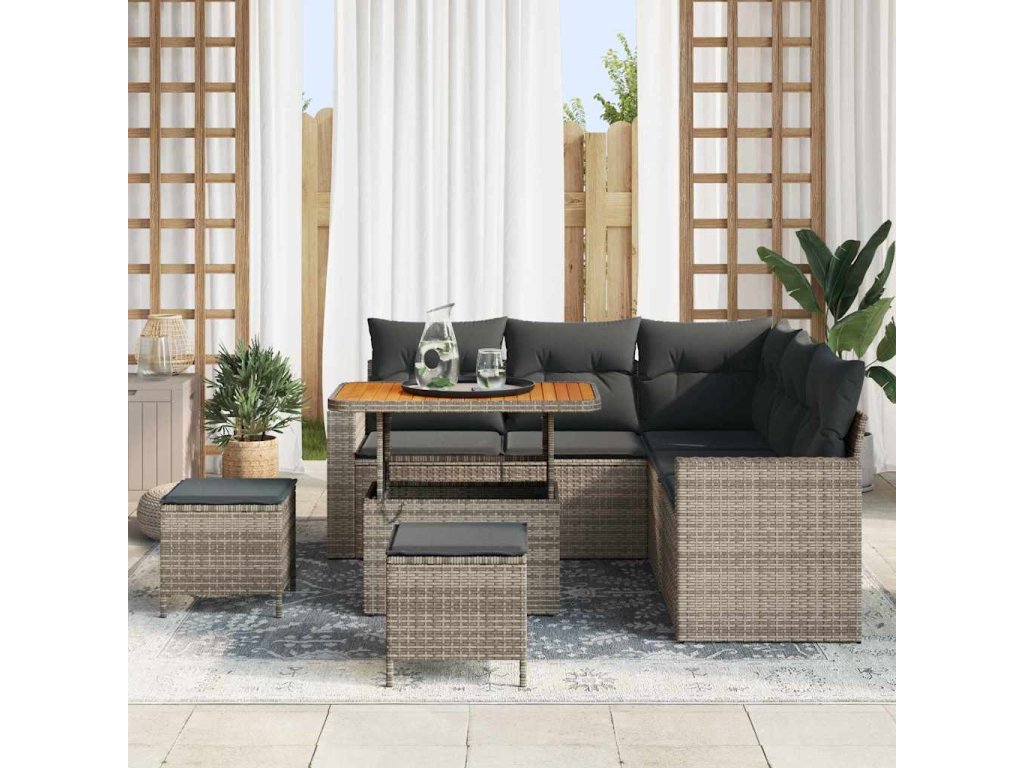 - Vysoce kvalitní materiály Sedací souprava je z prvotřídního poly ratanu a odolného masivního akáciového dřeva. Navrženo tak, aby vydrželo, materiály zajišťují, že set odolává slunci a dešti, přičemž si udrží eleganci a strukturu po sezónách.