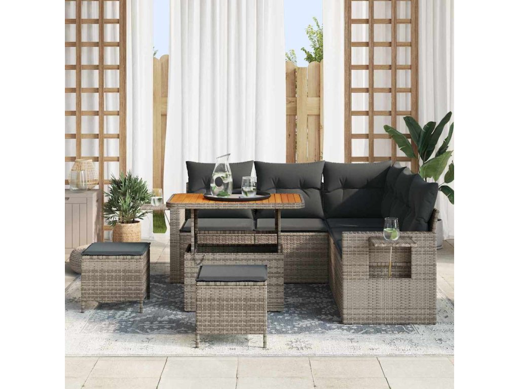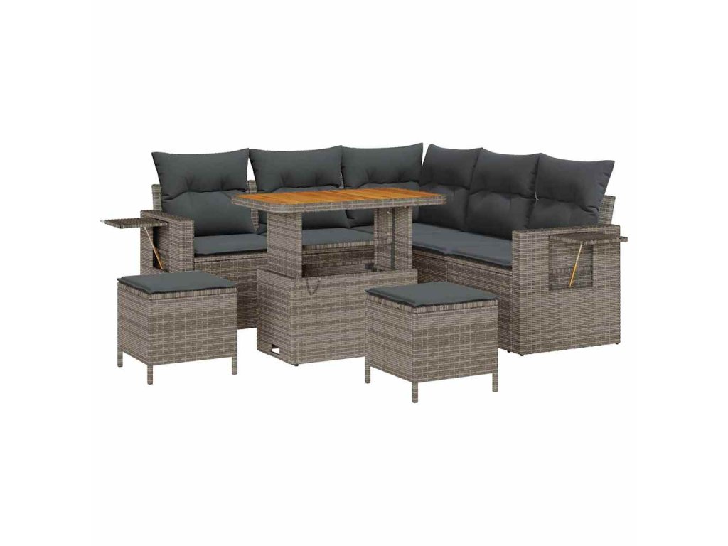 - Prémiové materiály: Sada modulárního zahradního gauče je z kvalitního polyratanu, známého svou odolností a schopností vydržet venkovní podmínky, což zajišťuje dlouhý životnost. Doplňuje ji masivní akáciové dřevo, které činí sadu přitažlivou a elegantní.