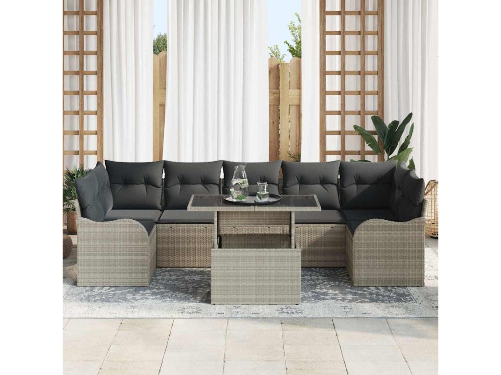 Tahle zahradní sedací souprava je elegantní volba na letní zábavu na vaší terase. Je navržená tak, aby byla jednoduchá a funkční, s čistými liniemi a málo ozdobami, což ji dělá ideální pro moderní zahrady nebo terasy. Její modulární uspořádání pro 8 lidí vám umožní flexibilně uspořádat sezení, ideální pro večírky nebo klidné noci pod hvězdami. Díky odolnému poly ratanovému materiálu tahle sada nejen vypadá skvěle, ale je také dlouhotrvající a pohodlná pro venkovní využití.