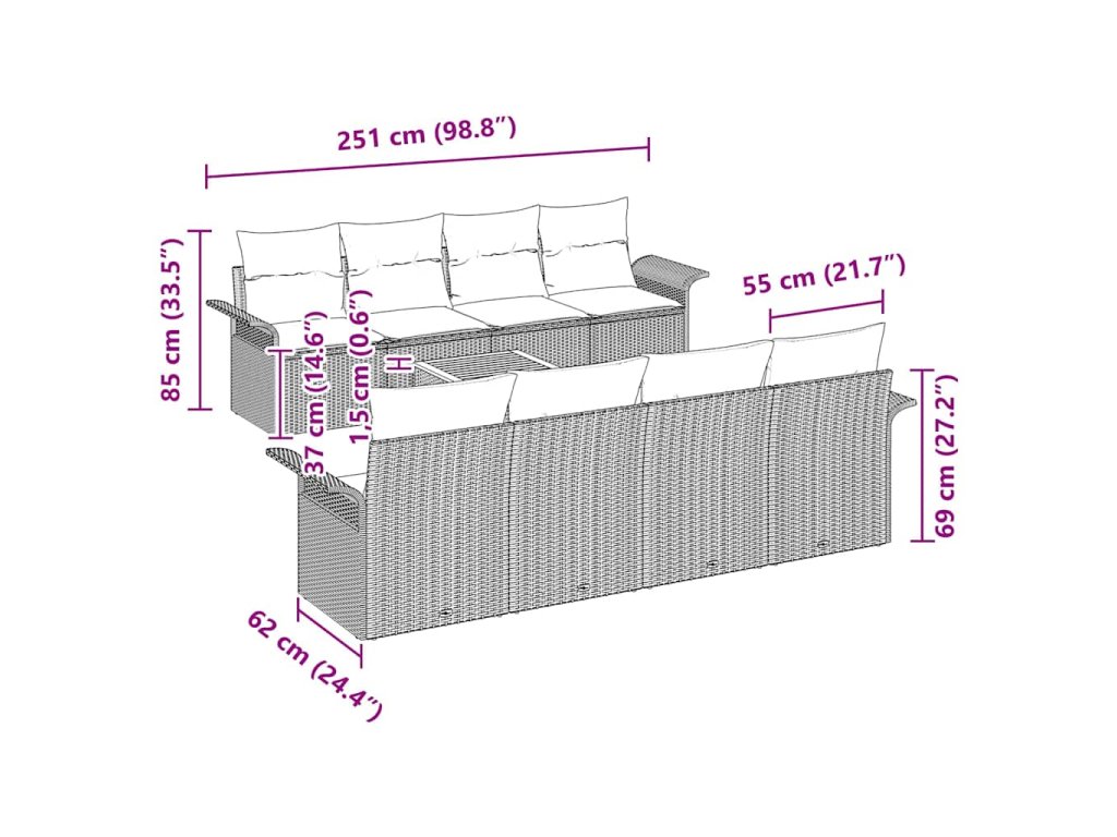 - 4 x Středová sedací část: 55 x 62 x 69 cm (D x Š x V)