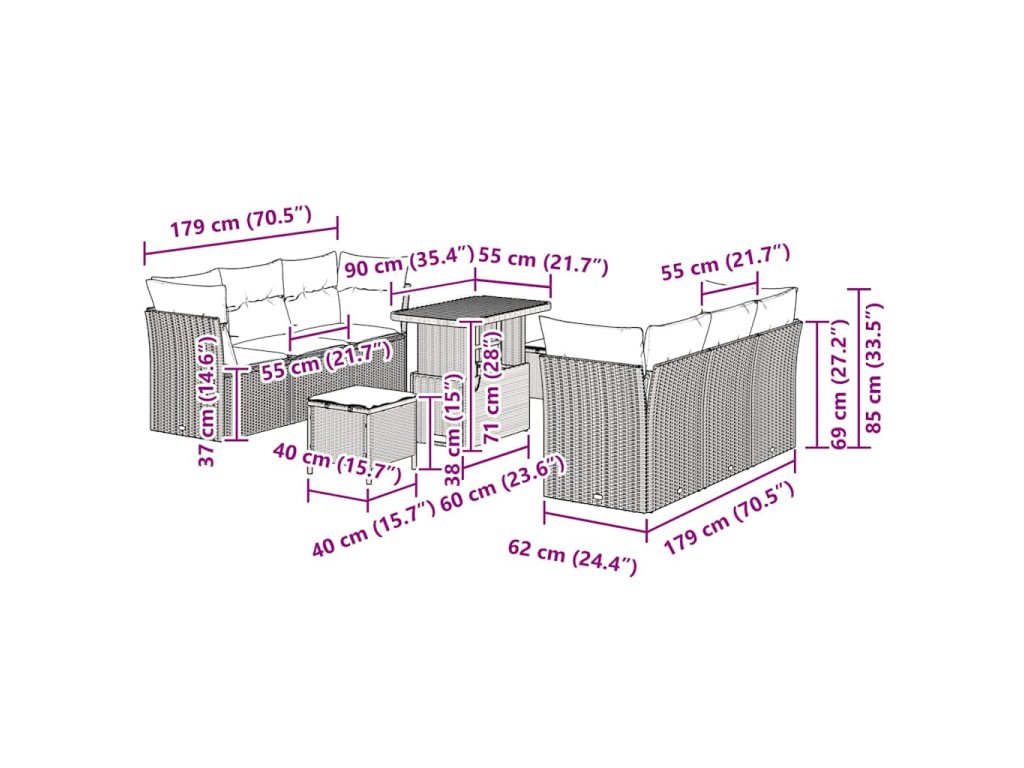 - Doporučené použití: Ideální na venek, nabízí pohodlí pro oslavy nebo odpočinek na terasách a zahradách. Modulární design uspokojí různá sezení, skvělé pro všechny akce od večeří po opalování.