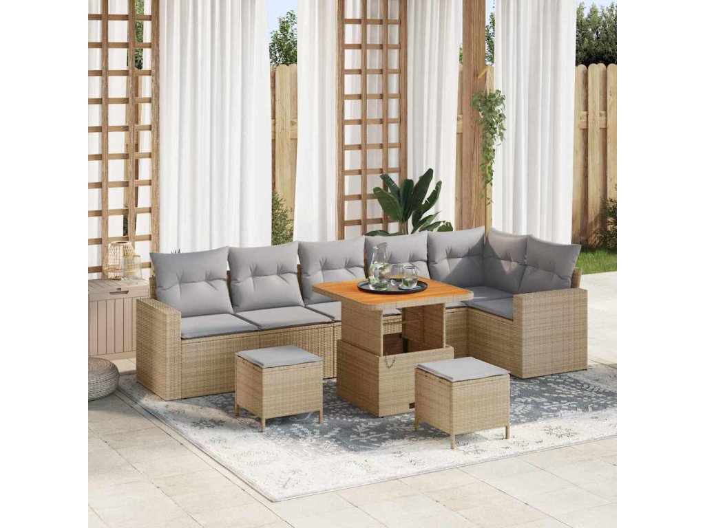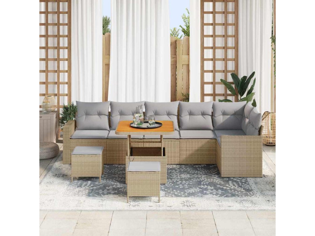 - Materiály: Tato zahradní sedací souprava je převážně z poly ratanu, což jí dodává šik vzhled, který se hodí k jakékoli venkovní výzdobě. Pevné akáciové dřevo přidává přírodní eleganci. Oba materiály jsou odolné vůči povětrnostním vlivům, takže máte spolehlivé a atraktivní sezení.