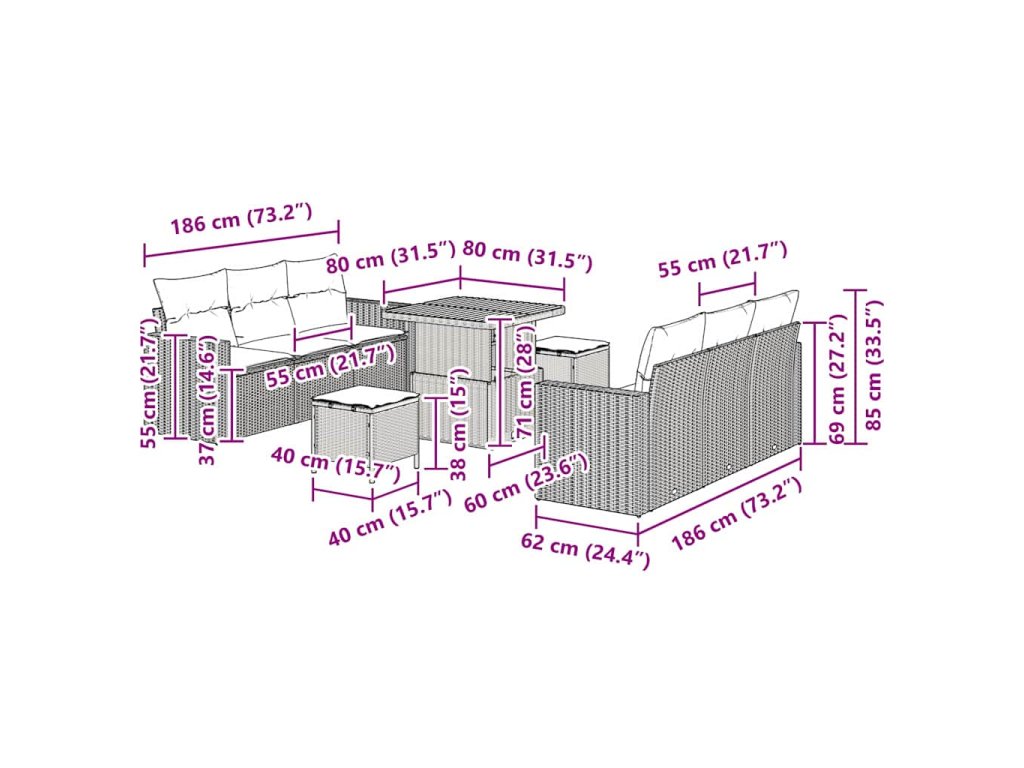 - Funkce / Design: Pohovka má výškově nastavitelné stolky, které se snadno přizpůsobí z příjemného kávového stolu na funkční jídelní stanici. Její modulární design umožňuje lehkou přestavbu a přizpůsobení různým společenským situacím, zatímco udržuje lehkou strukturu, což usnadňuje přesun.