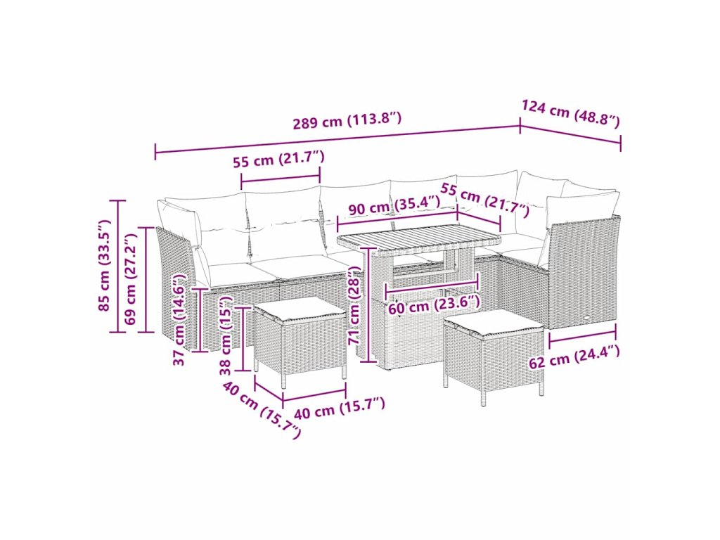 - 3 x Rohové sedadlo: 62 x 62 x 69 cm (D x Š x V)