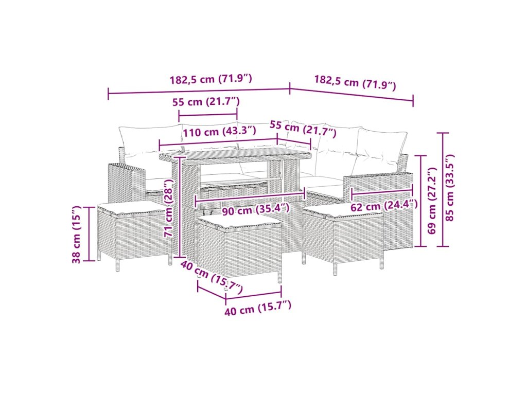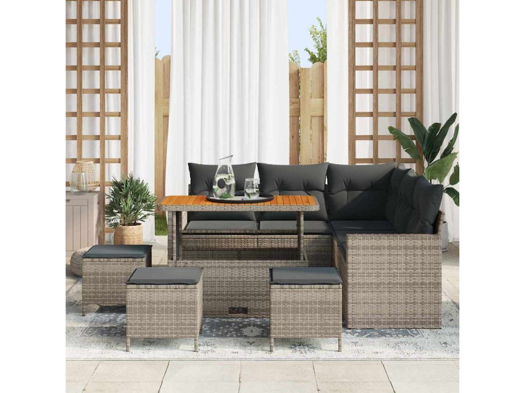 - Vysoce kvalitní materiály Sedací souprava je z prvotřídního poly ratanu a odolného masivního akáciového dřeva. Navrženo tak, aby vydrželo, materiály zajišťují, že set odolává slunci a dešti, přičemž si udrží eleganci a strukturu po sezónách.