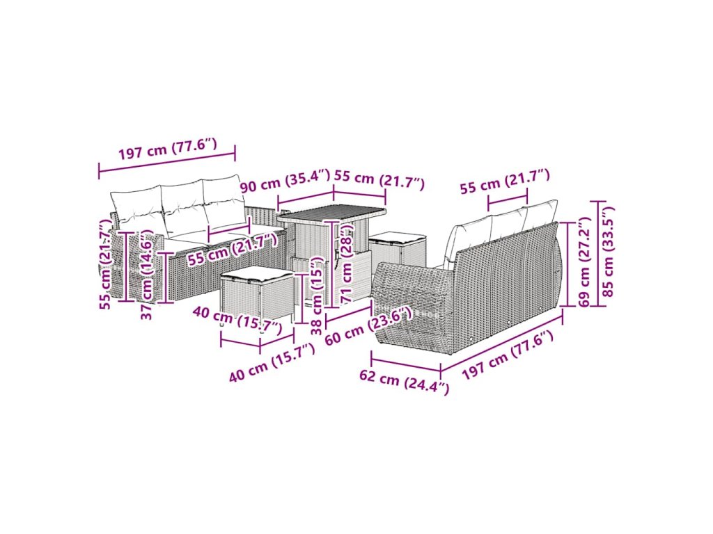 Tato multifunkční zahradní pohovka mění venkovní odpočinek s jejím moderním modulárním designem. Elegantní provedení má čisté linie a málo ornamentů, ideální pro zahrady a terasy. Tento set pohovek je perfektní volba pro venkovní nadšence, kteří si cení stylu i praktičnosti, poskytuji příjemné místo na relaxaci a setkávání s lidmi. Užívejte si chvíle venku, když moderní vzhled nábytku zapadá do okolí a zkrášluje jakoukoli venkovní plochu.