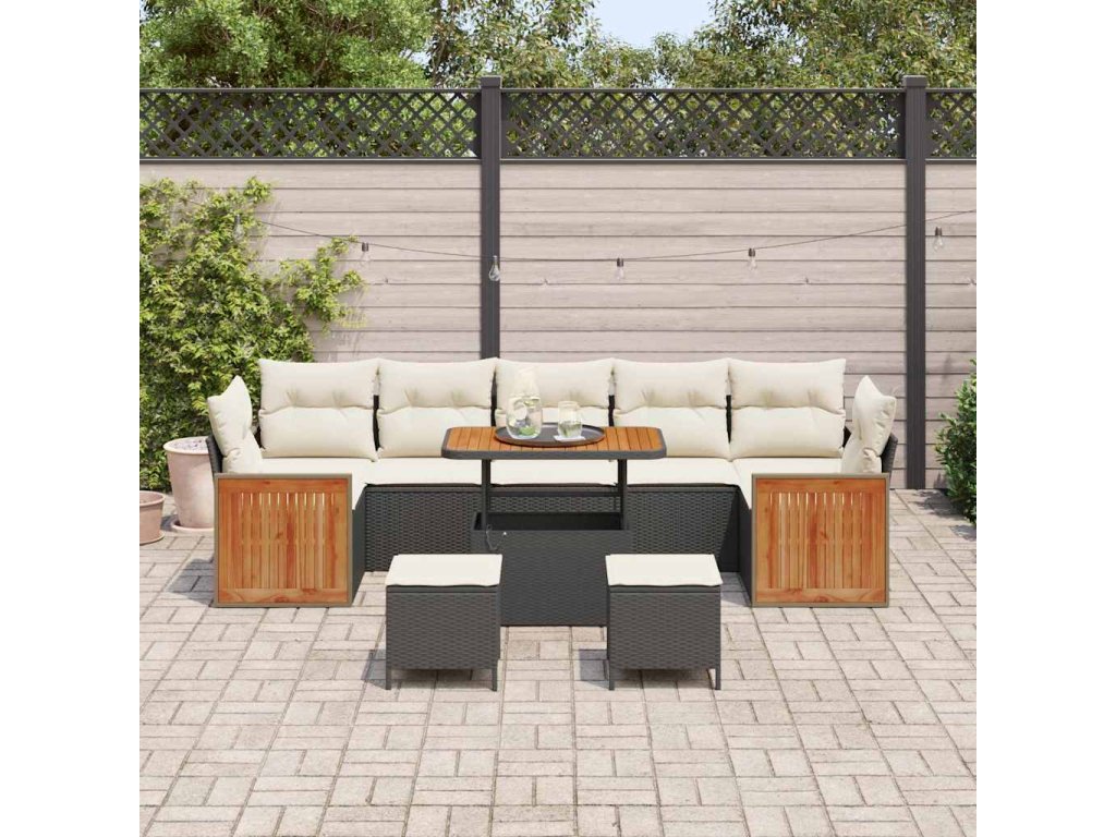 - Součásti: Tato sada zahrnuje čtyři arm sofy, tři střední sedadla, dva taburety a univerzální stůl, vše navržené pro pohodlí a pohodlnost. Loketní opěrky a stoly z masivního akáciového dřeva dodávají přírodní krásu s teplými povrchy.