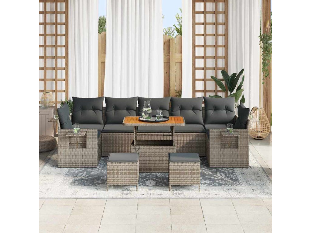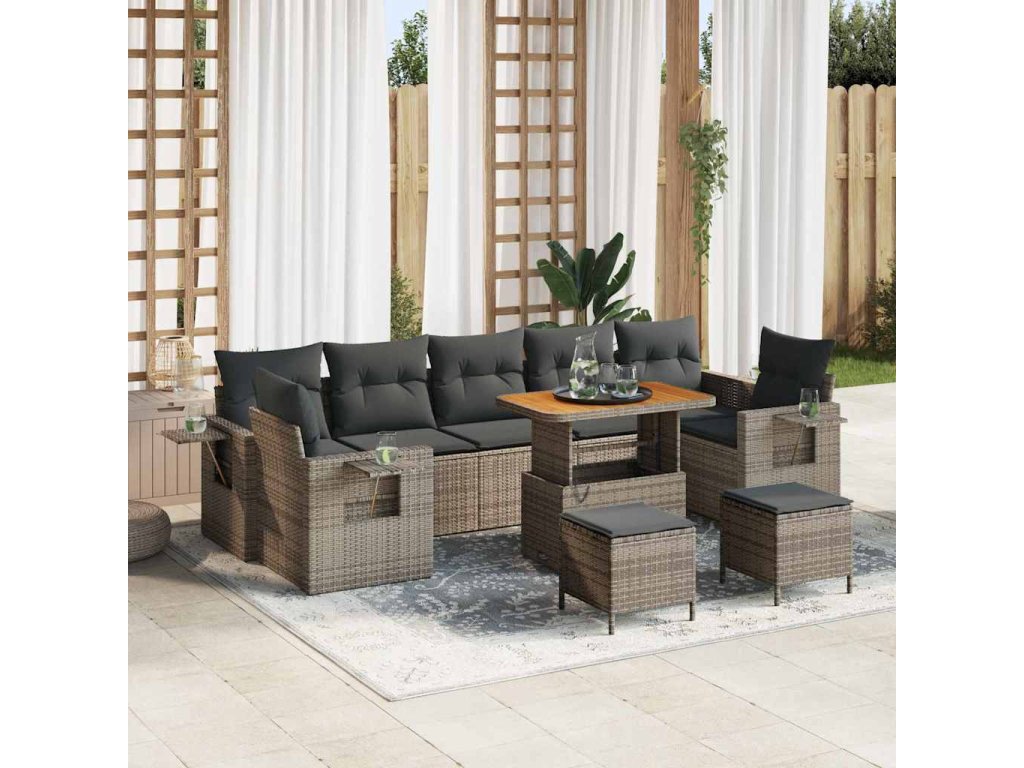 Tento modulární zahradní pohovkový set kombinuje moderní styl s multifunkčním využitím a promění jakoukoliv zahradu nebo terasu na příjemné místo. S tenkým profilem a minimalistickým designem z poly ratanu a masivním akáciovým dřevem, je odolný a skvěle vypadá. Ať už pořádáte letní večírek, nebo si chcete užít klidný večer s knihou, tenhle set vás zve, abyste si náležitě užili venkovní život.