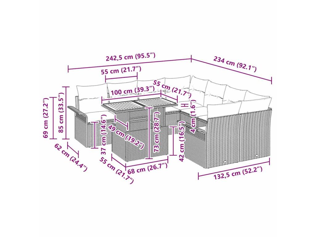 Tato modulární zahradní sedací souprava vnese do vašeho venkovního prostoru moderní styl a praktičnost. Je navržena tak, aby se přizpůsobila terasám a zahradám, a nabízí pohodlí jak pro společenské akce, tak pro soukromou relaxaci. S čistými liniemi a jednoduchým geometrickým designem působí elegantně a současně, což z ní dělá skvělý doplněk pro moderní venkovní styl. Představte si ji jako centrum zahradní párty, které vyzařuje pohostinnost a svádí k dlouhému odpočinku na slunci nebo ve stínu.