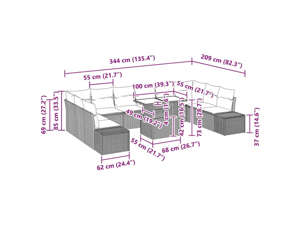 - Celkové rozměry: 344 x 209 x 85 cm (D x Š x V)