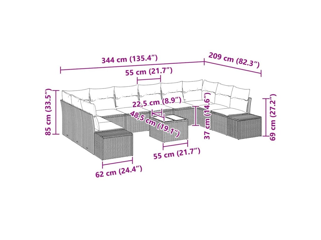 - 2 x Boční pohovka: 55 x 55 x 37 cm (D x Š x V)