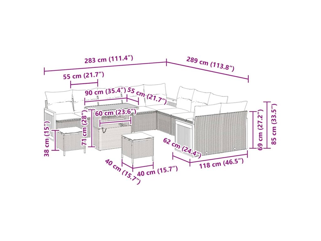 - Celkové rozměry: 283 x 289 x 85 cm (D x Š x V)