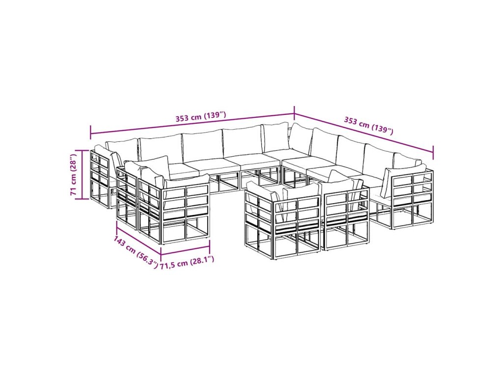 - 7 x rohové sedadlo: 71.5 x 71.5 x 71 cm (D x Š x V)
