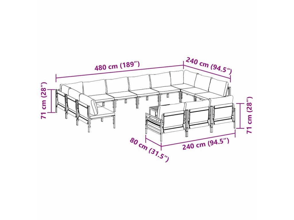 - 9 x Centrální pohovka: 80 x 80 x 71 cm (D x Š x V)
