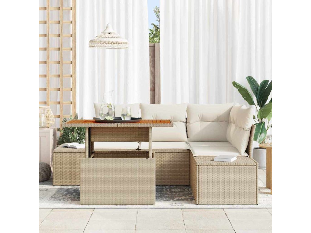 - Materiály: Tento zahradní pohovkový set je vyroben z prémiového poly ratanu, známého pro své vlastnosti odolné vůči počasí a stylovou tkaninou, ideální pro venkovní prostředí. Rám z práškově lakované oceli zajišťuje pevnost a eleganci, zatímco masivní dřevo akácie dodává teplo a přírodní vzhled, který ladí s jakoukoli zahradní dekorací.