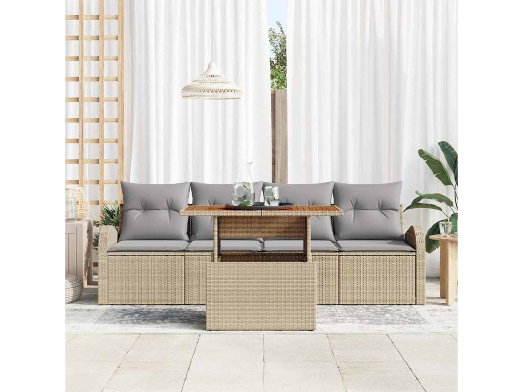 - Zahrnuté komponenty: Sada obsahuje dvě sofa s opěrkami na ruce, která mají skryté úložné prostory, dvě střední sedačky a multifunkční zahradní stůl, vše navržené pro pohodlí a úsporu místa. Úložný prostor v sedačkách je skvělý na schování polštářů před deštěm a udržení pořádku.