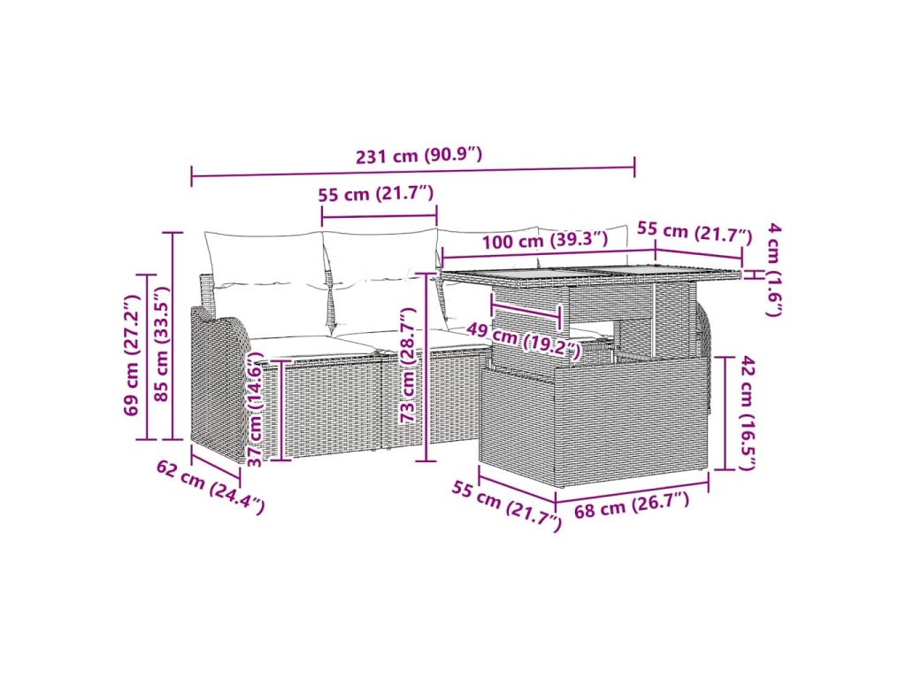 Náš modulární zahradní gaučový set promění každou zahradu nebo terasu na skvělé místo pro relaxaci a setkávání s přáteli. Moderní styl s čistými liniemi nabízí dvě pohovky s opěrkami, dvě středová sedadla a univerzální stůl, ideální pro venkovní akce nebo klidnou pohodu. Hnědé tóny poly ratanu a akáciového dřeva krásně ladí s venkovním prostředím, každý kus je tak okouzlující jako pohodlný.