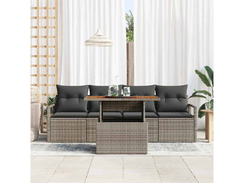 - Funkční prvky: Souprava obsahuje dvě pohovky s opěrkami a dvě středová místa se zabudovaným úložným prostorem pro vaše venkovní věci. K tomu pevný zahradní stůl z akáciového dřeva, ideální na jídlo nebo neformální setkání. Všechno je navržené tak, abyste měli uspořádaný venkovní prostor.