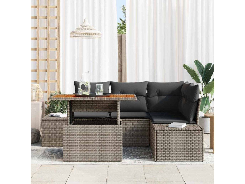 - Materiály: Tento zahradní pohovkový set je vyroben z prémiového poly ratanu, známého pro své vlastnosti odolné vůči počasí a stylovou tkaninou, ideální pro venkovní prostředí. Rám z práškově lakované oceli zajišťuje pevnost a eleganci, zatímco masivní dřevo akácie dodává teplo a přírodní vzhled, který ladí s jakoukoli zahradní dekorací.