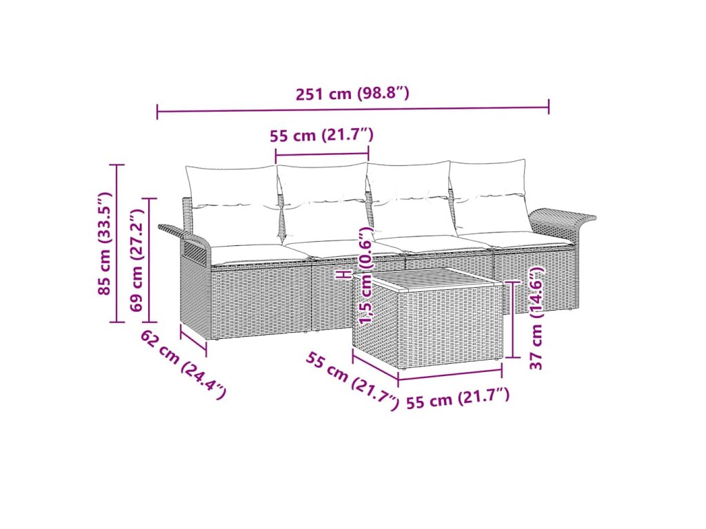 - Součásti: Set obsahuje dvě centrální sedáky, dvě arm pohovky a zahradní stůl, všechny s odnímatelnými podsedáky na zip. Každý kus je promyšleně navržen pro maximální pohodlí a relaxaci.