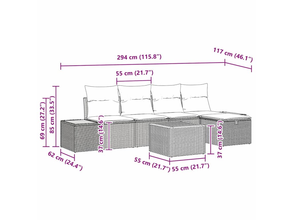 - Funkční prvky Tento set má 2 středové sedačky, 2 boční gauče, podnožku a zahradní stůl, takže všichni budou mít místo při venkovních shromážděních. Všechny části jsou modulární, můžete si je nastavit podle prostoru a potřeb. Ergonomický design s polstrovanými poduškami zajišťuje maximální pohodlí.