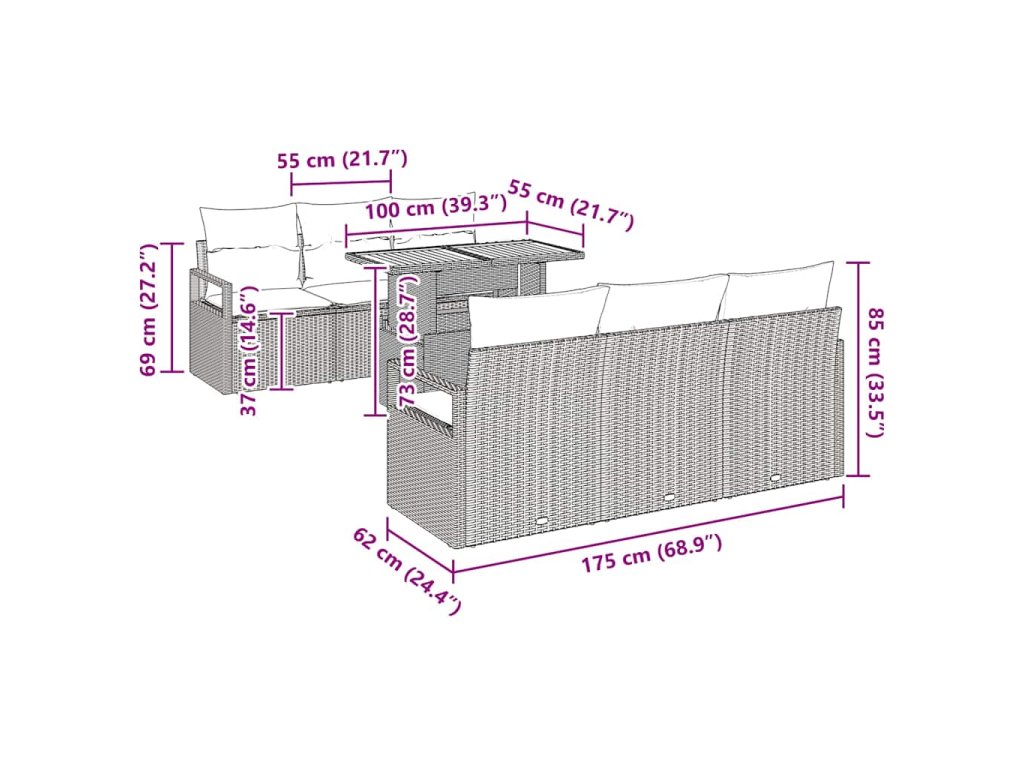 Tato zahradní pohovka s polštáři z polyratanu krásně spojuje styl a praktičnost, připravená oživit jakoukoli zahradu nebo terasu. Její tkaný vzhled a elegantní design dávají moderní a přátelskou atmosféru, ideální jak pro společenské akce, tak pro chvíle samoty. Navržená pro venkovní prostory, tato sada splňuje všechny požadavky na vzhled a užitečnost, a dělá ji tak perfektní pro každého, kdo se stará o styl i funkčnost při venkovním povalování. Materiály byly pečlivě vybrány, aby odolaly různým sezónám, čímž je zajištěno, že budou vypadat skvěle a vydrží.