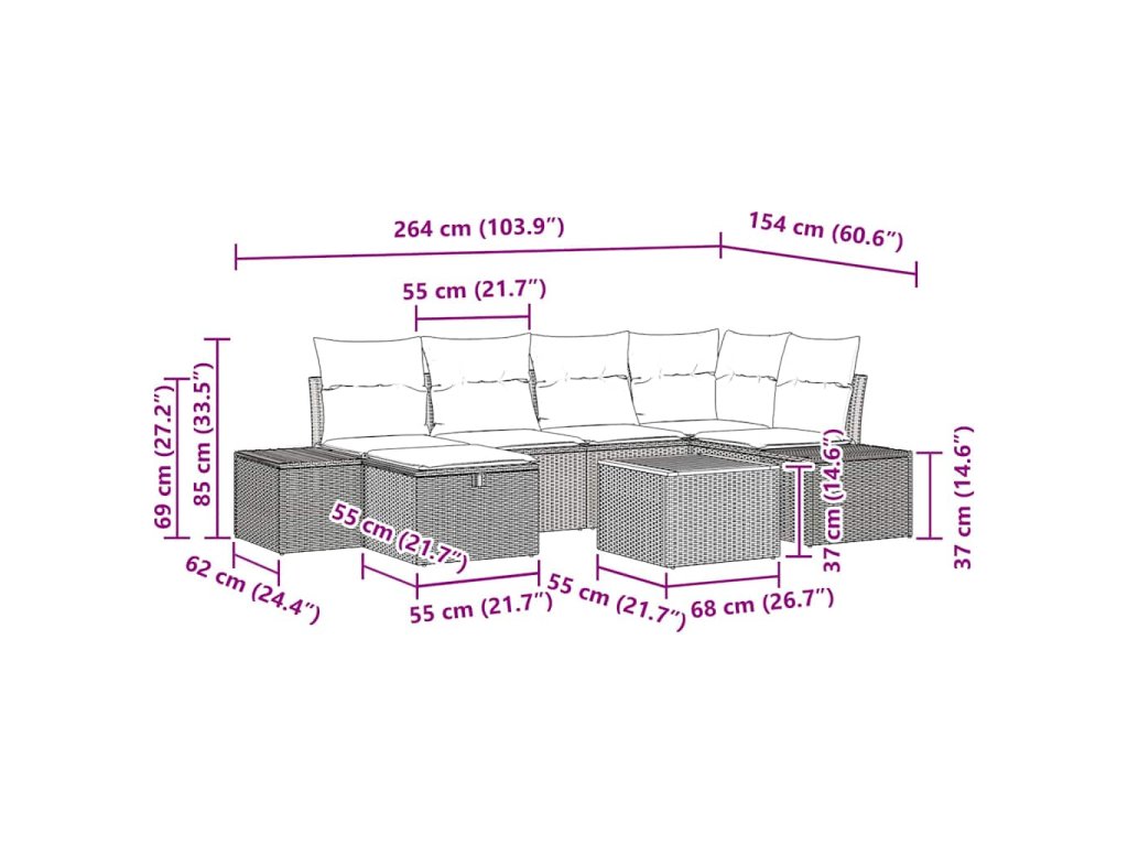- Součásti: Set obsahuje 2 centrální sedačky, 1 rohovou sedačku, 2 boční pohovky, taburet a stůl. Každá sedačka má pohodlné opěradlo a integrované úložné prostory pro nezbytnosti.