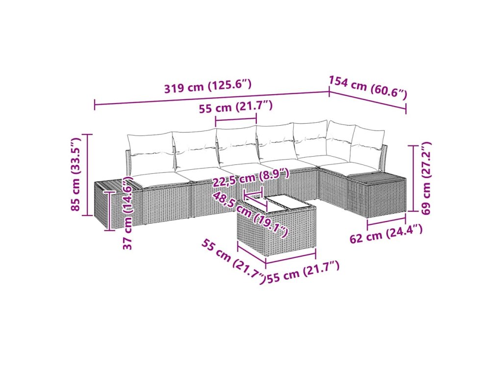 - Materiály: Tento venkovní sofa set je vyroben převážně z kvalitního poly ratanu, což zajišťuje odolnost a styl. Poly ratan vydrží UV záření, takže si dlouho zachová pěkný vzhled i na slunci. Je podpořen práškovou ocelí, takže je pevný a atraktivní pro venkovní použití.